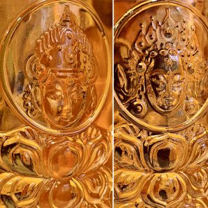 Above it, in the clouds, rest Rato Machindranath, Kathmandu’s deity of monsoon, and Varuni, the Vedic deity of spirits. Their embossed impressions are based on actual 16th century thangkas.